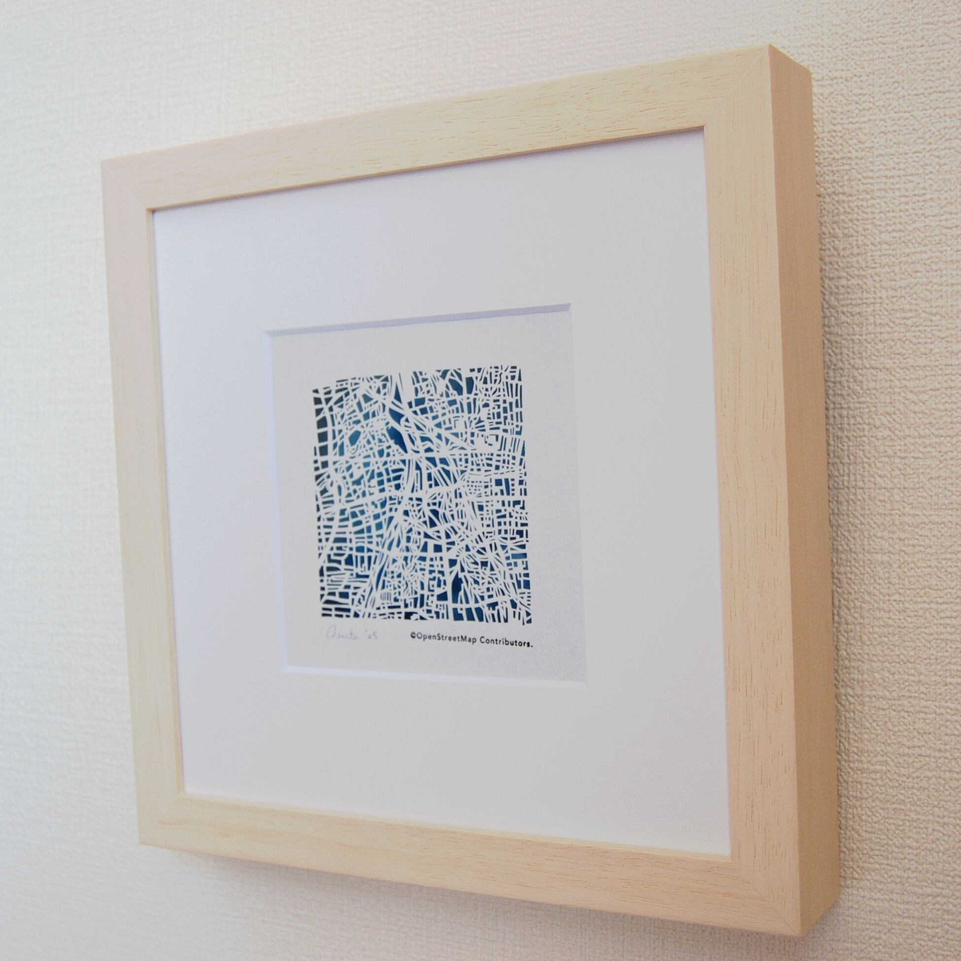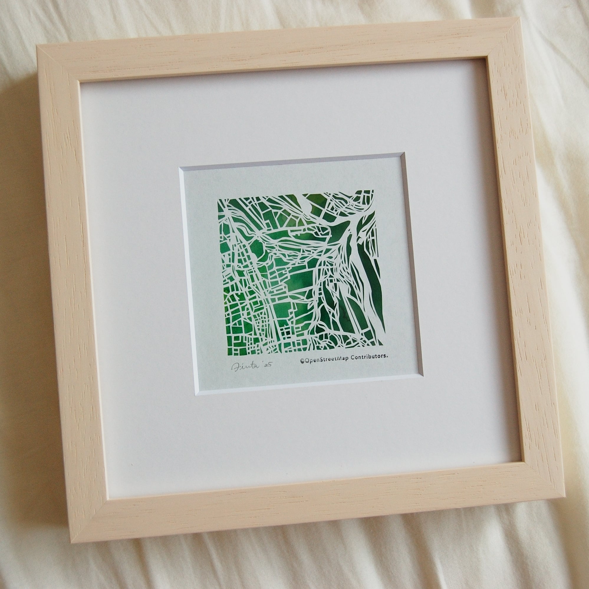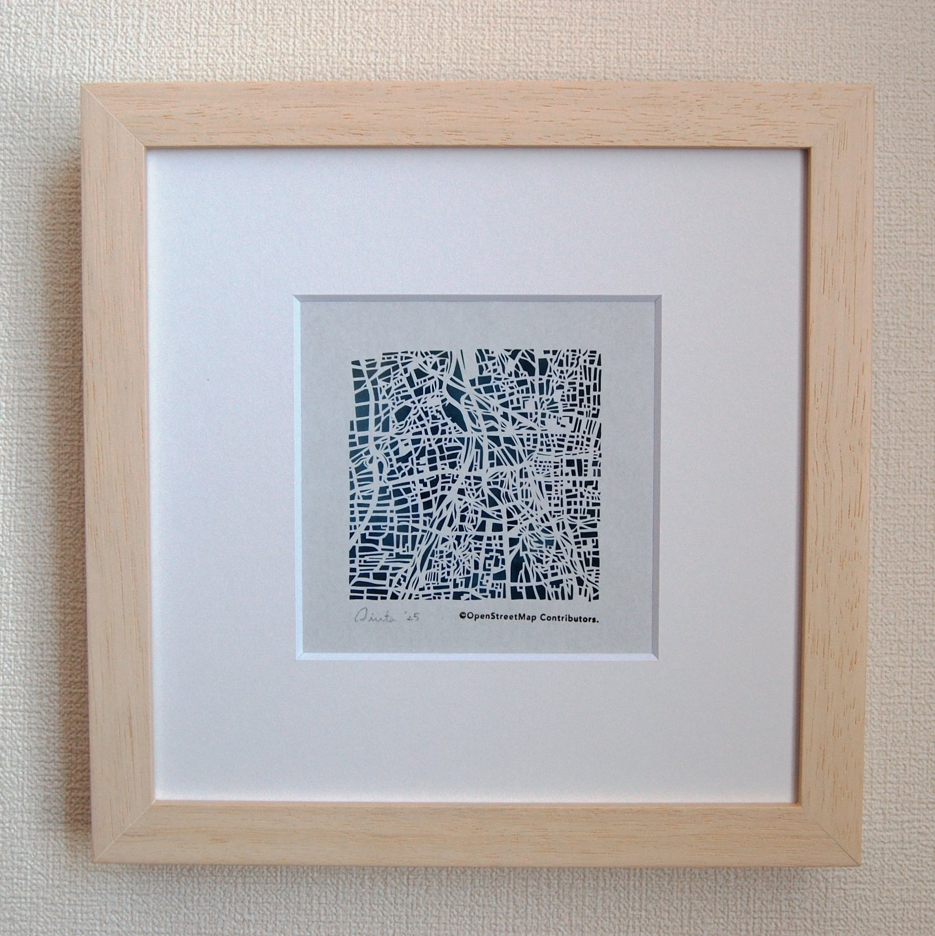 昭和記念公園の道路や水の流れを、実在の地図データから「線」として切り出した75mm角の切り絵作品です。額装した状態でお届けするため、開封後すぐに飾れます。