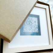 諏訪湖の道路や水の流れを、実在の地図データから「線」として切り出した75mm角の切り絵作品です。額装した状態でお届けするため、開封後すぐに飾れます。