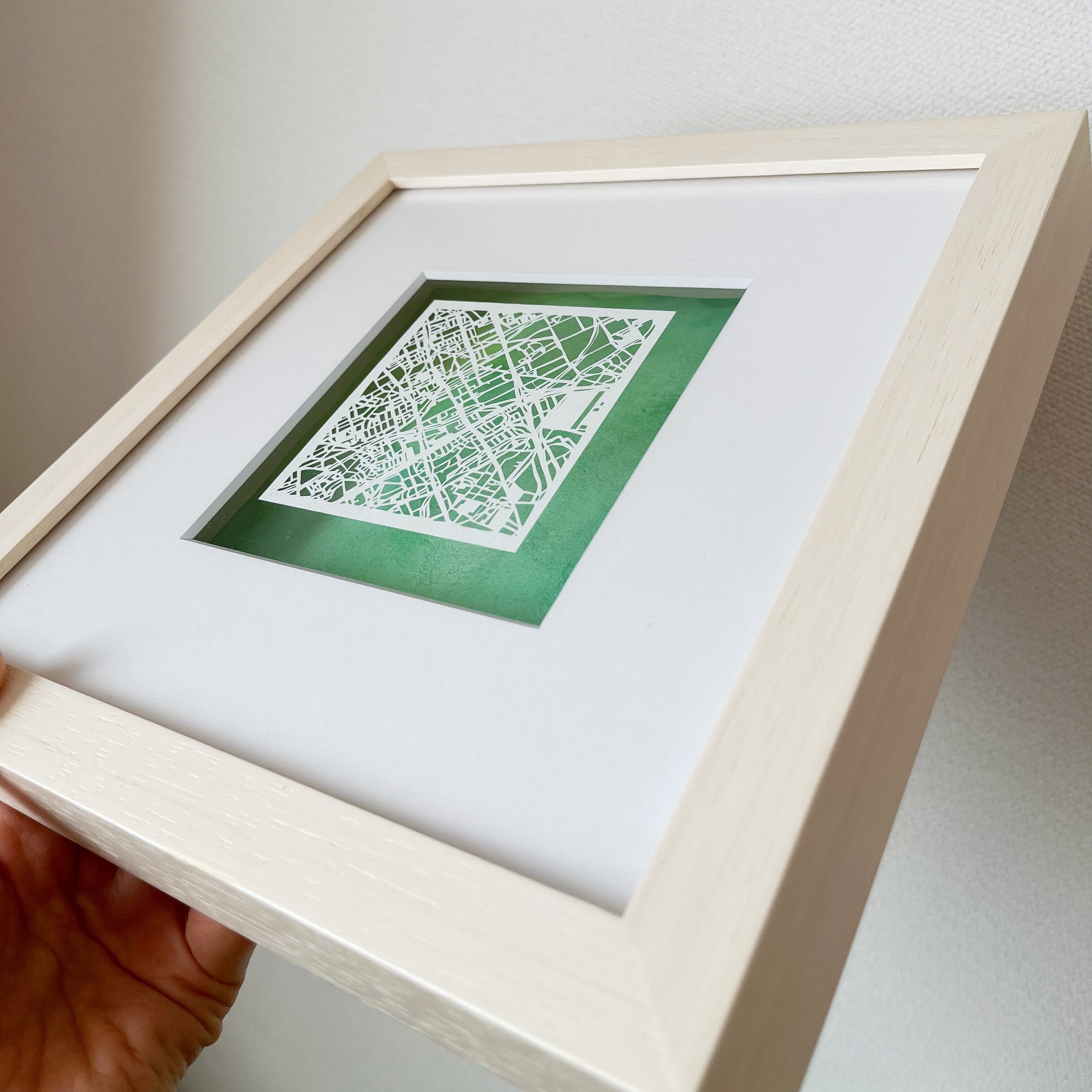 背景水彩は「青」または「緑」からお選びいただけます。透明水彩の色が、切り絵の陰影をやわらかく引き立てます。