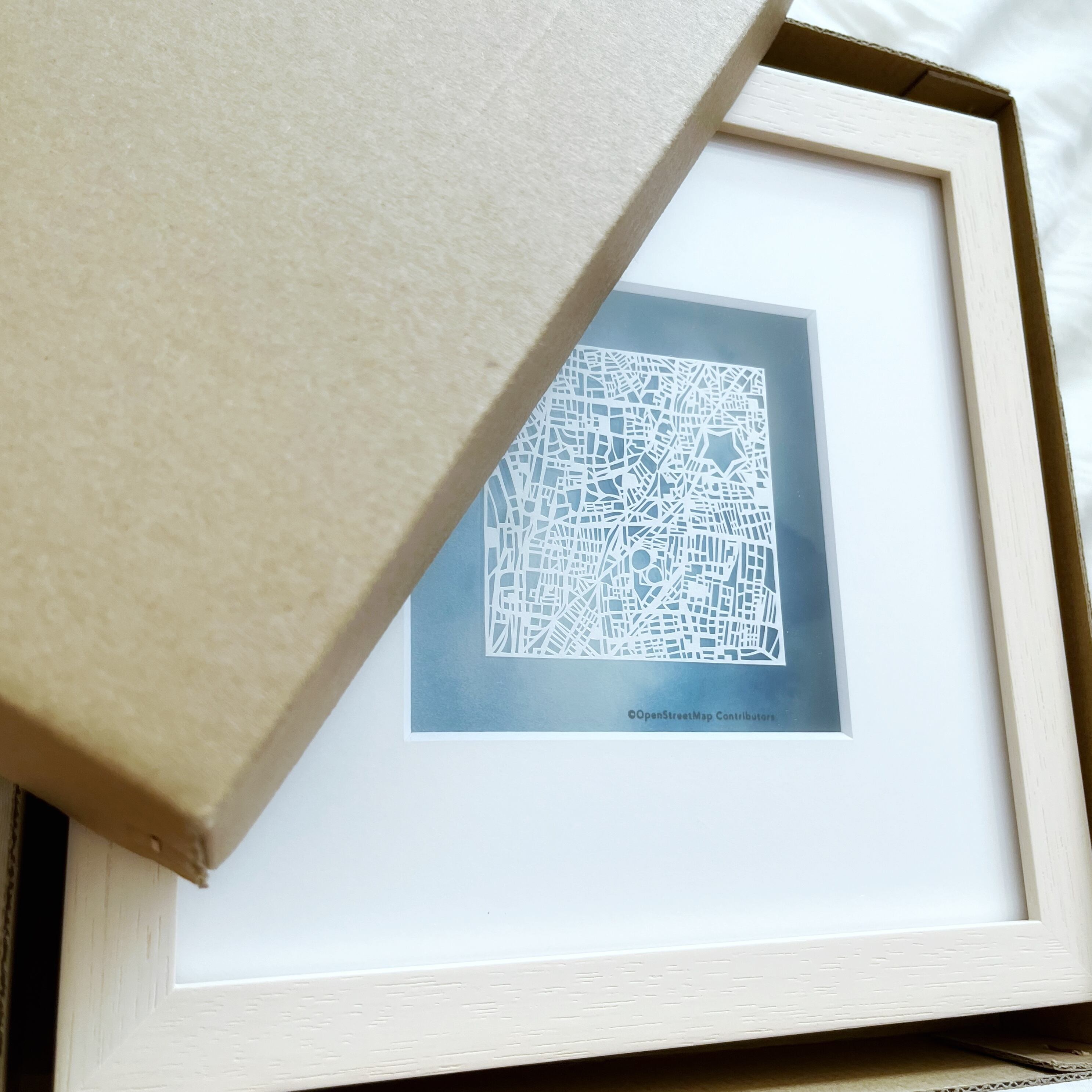 松阪駅の道路や水の流れを、実在の地図データから「線」として切り出した75mm角の切り絵作品です。額装した状態でお届けするため、開封後すぐに飾れます。