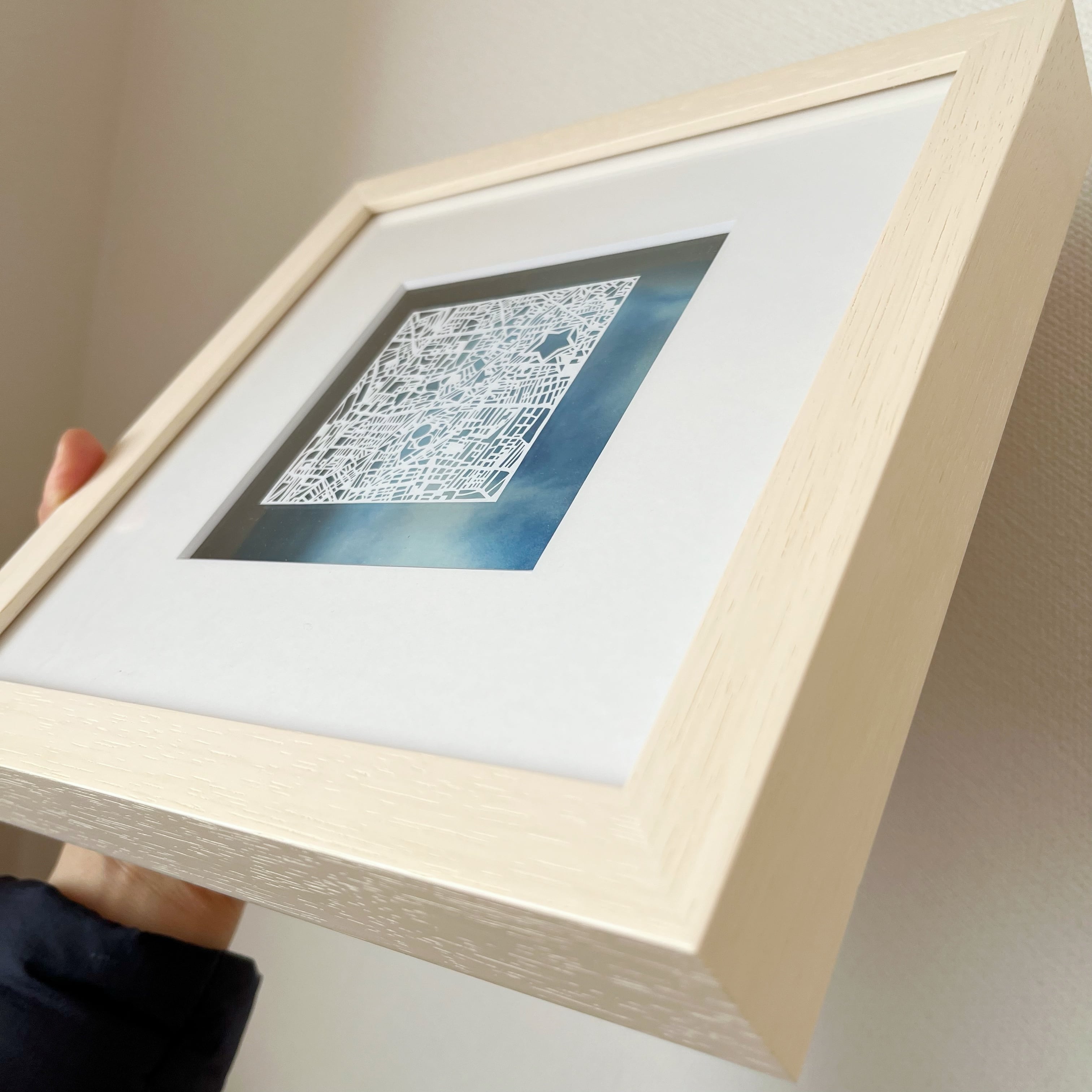 上野駅の道路や水の流れを、実在の地図データから「線」として切り出した75mm角の切り絵作品です。額装した状態でお届けするため、開封後すぐに飾れます。