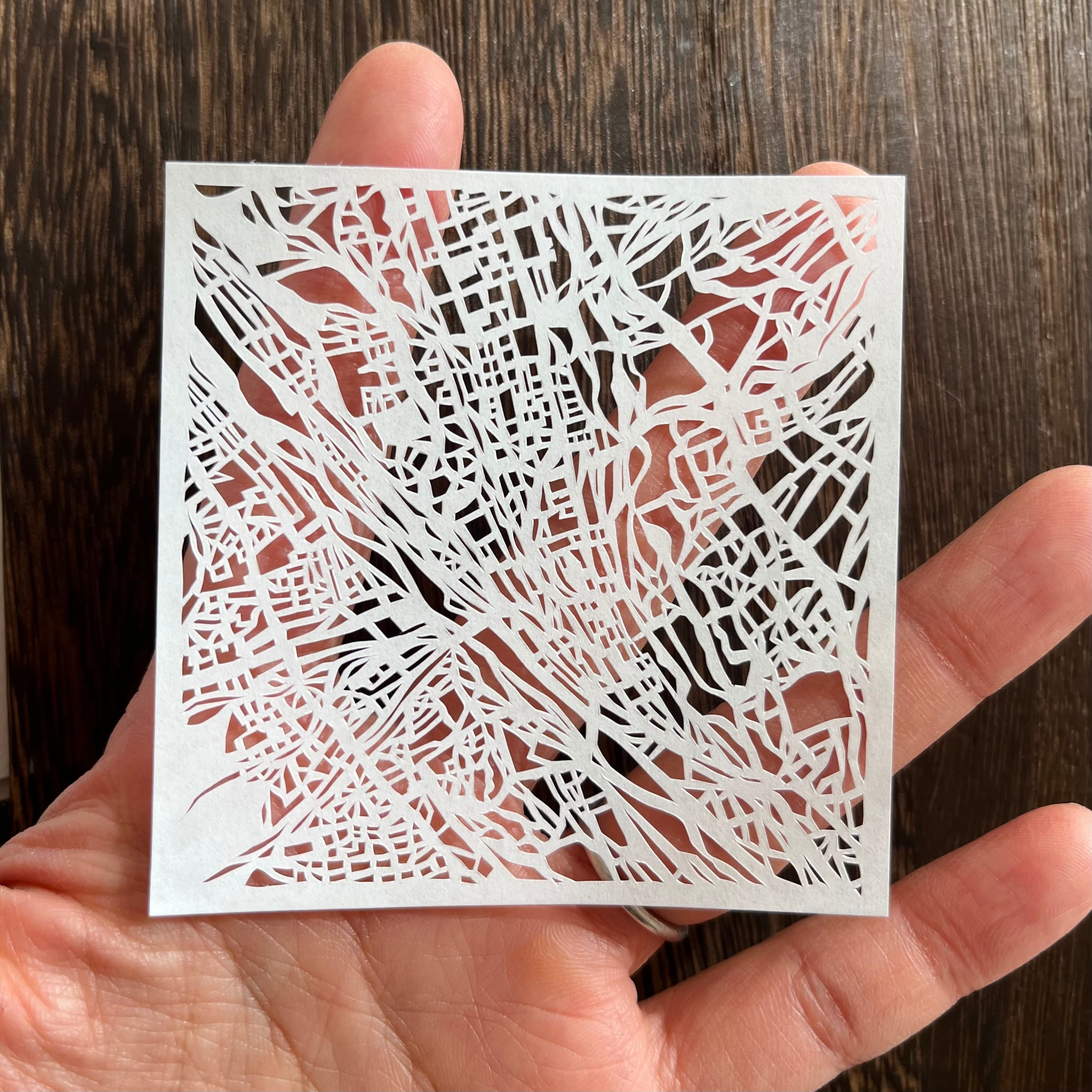 川の流れ、海岸線、道路の分岐。OpenStreetMapの地図データをもとに、デザインカッターで一点ずつ手作業で切り出しています。