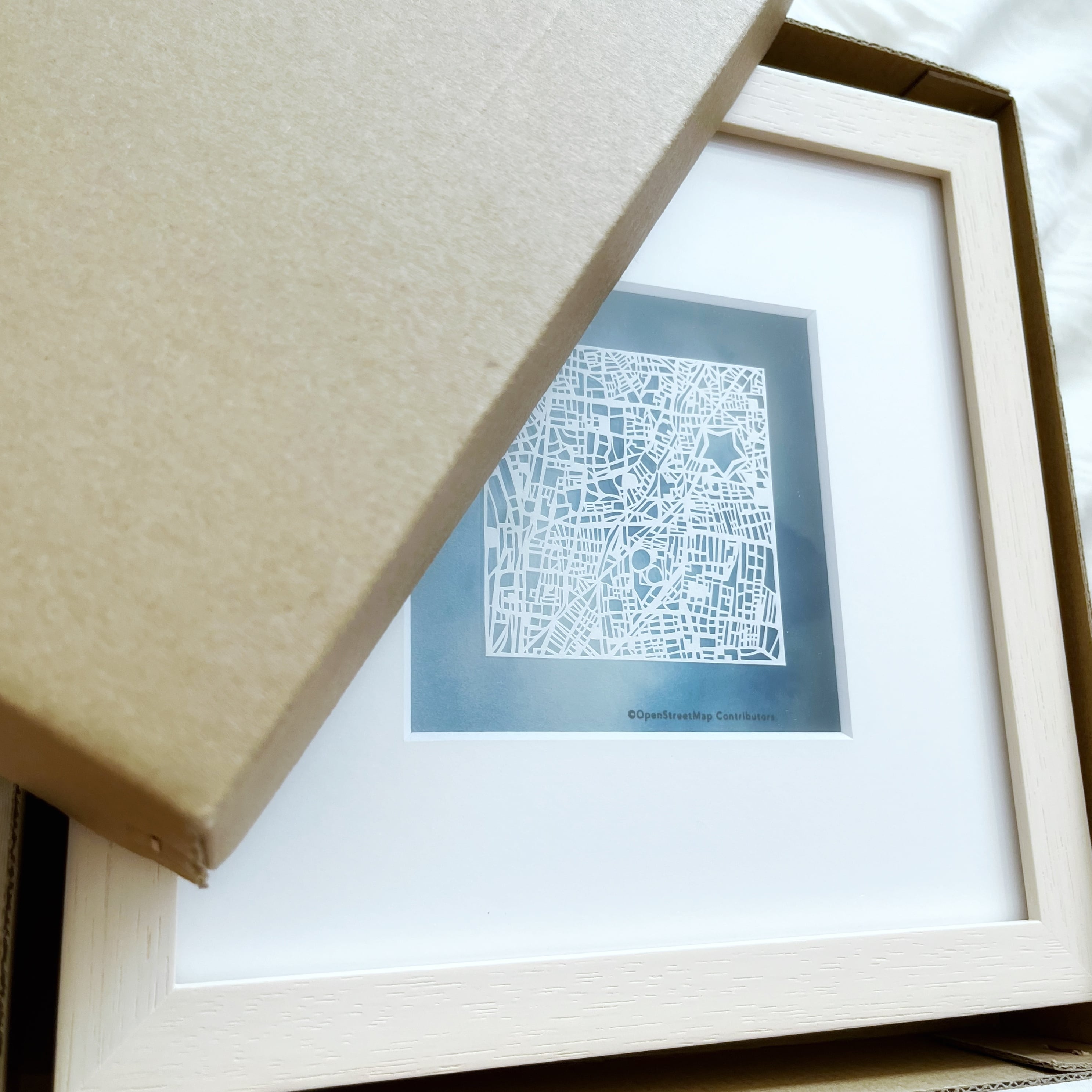 【一点もの/額装済み】韮崎駅の道路や水の流れを、実在の地図データから「線」として切り出した75mm角の切り絵作品です。額装した状態でお届けするため、開封後すぐに飾れます。